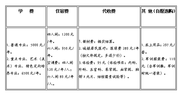1.学校所有收费严格按照物价部门审批标准收取。学费及住宿费按学年缴纳,代收费和其他费用入学时必须一次性缴清。交费项目及标准如下: