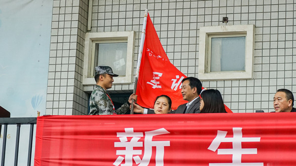 最后,校党委书记魏文芳向军训团团长陶明教官庄重授旗。